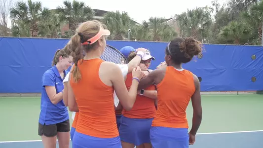 Doubles action saw UF secure the doubles point with victories on court one and three. The No. 7-ranked tandem of Brooke Austin and Kourtney Keegan cruised to a 6-1 win over the No. 61-ranked pairing of Ellie Yates and Astra Sharma. Anna Danilina and Brianna Morgan clinched early lead for UF with a 6-4 win over Fernanda Contreras and Sydney Campbell.