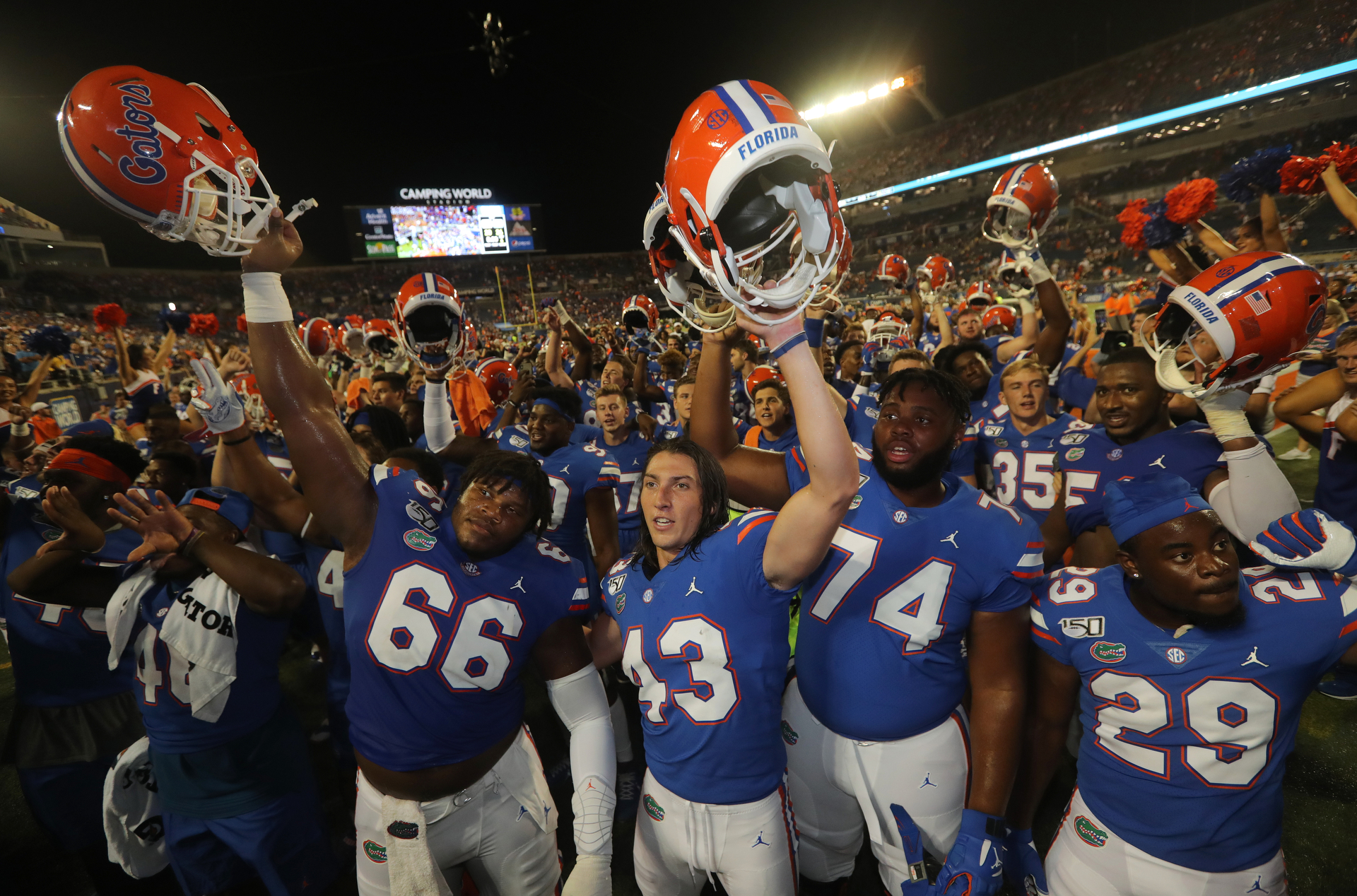 Florida players celebrate with fans in Orlando after their Aug. 24 defeat of Miami. The Gators will look to go 2-0 for the first time since 2016 when they take on FCS opponent Tennessee Martin in the 2019 home opener Saturday night at Spurrier/Florida Field.