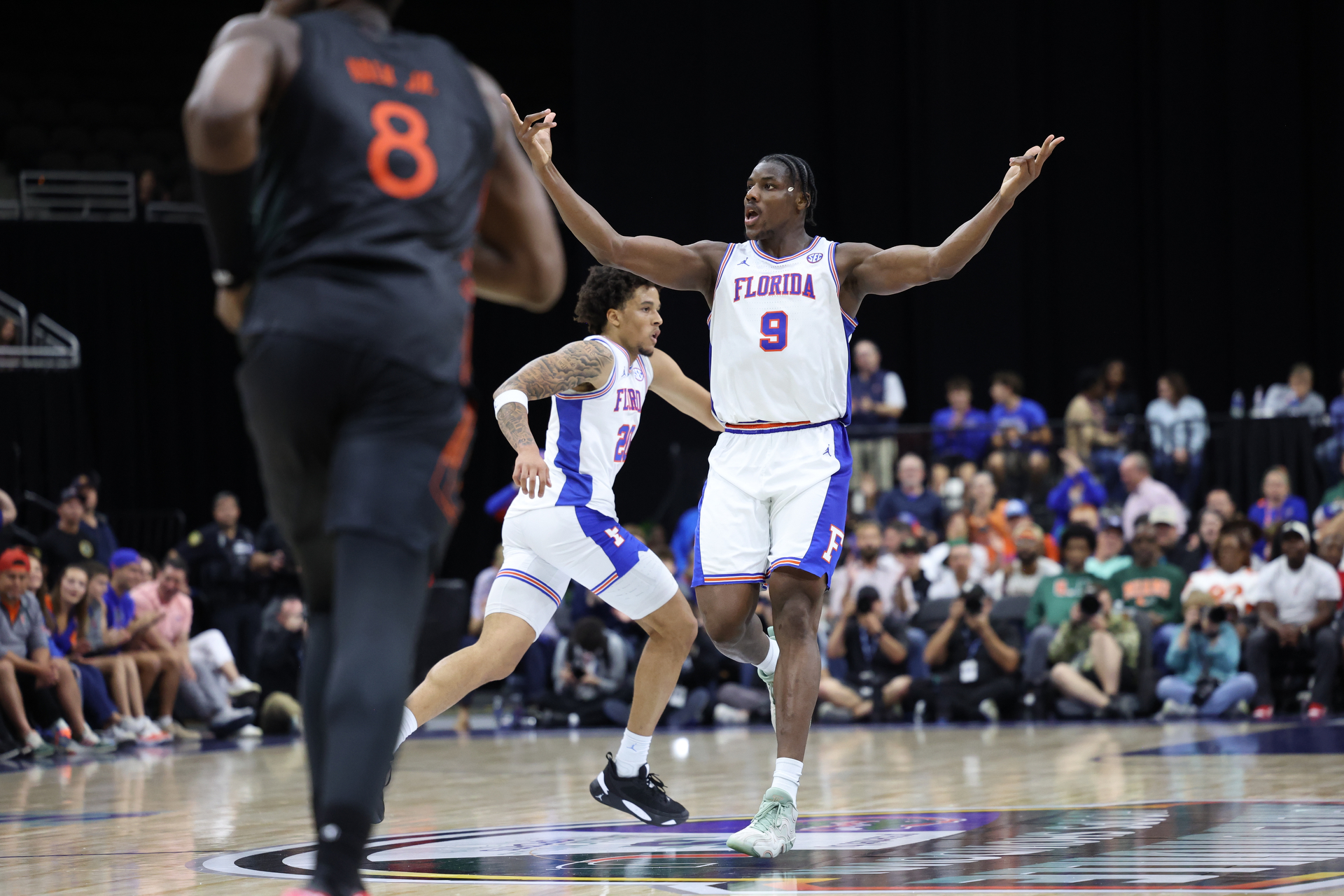 Gators center Rueben Chinyelu(9) finished with 16 points, 12 rebounds and several gestures to the fans.