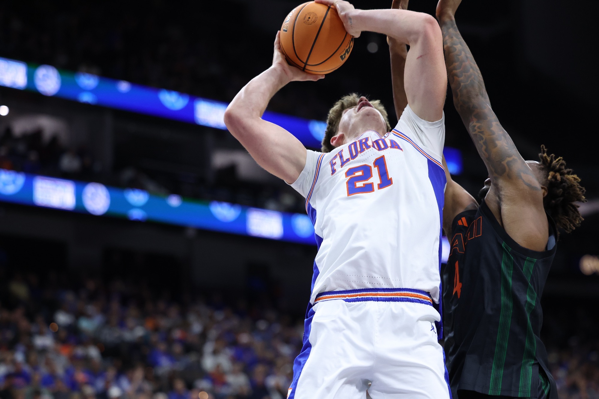 Florida forward Alex Condon(21) going to work down low on his way to 19 points and seven rebounds.