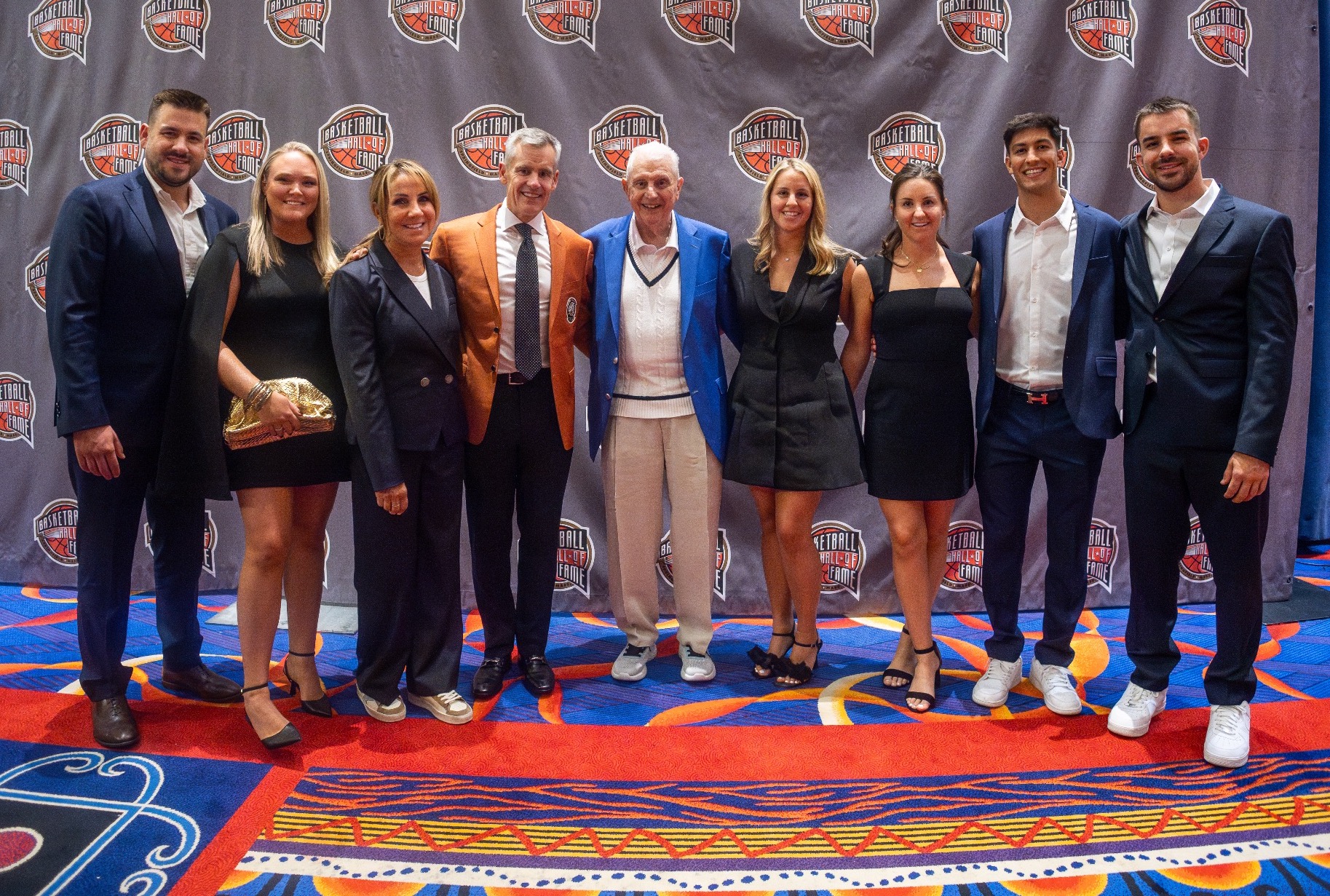 Bill Donovan flanked by his family at Billy D's Hall of Fame induction in September 2025 (from left): grandson Billy Jr. and wife Lauren; wife Christine and Billy D; patriarch Bill; grandaughter Connor; grandaughter Hasbrouck and husband Jahan; grandson Bryan.