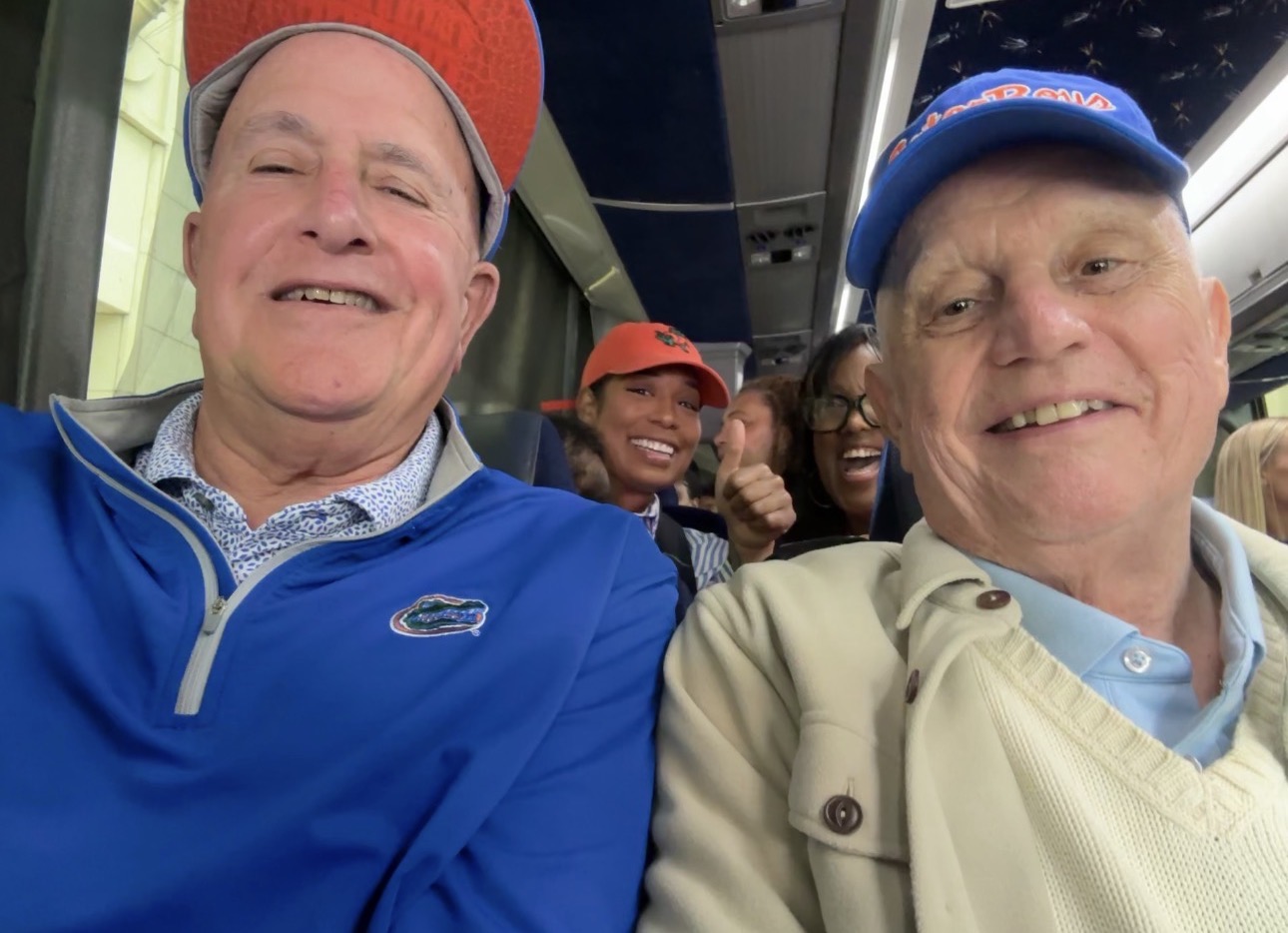 Two national-champion Florida dads: Scott Golden (left) and Bill Donovan (right) on the bus to the NCAA title game last April.