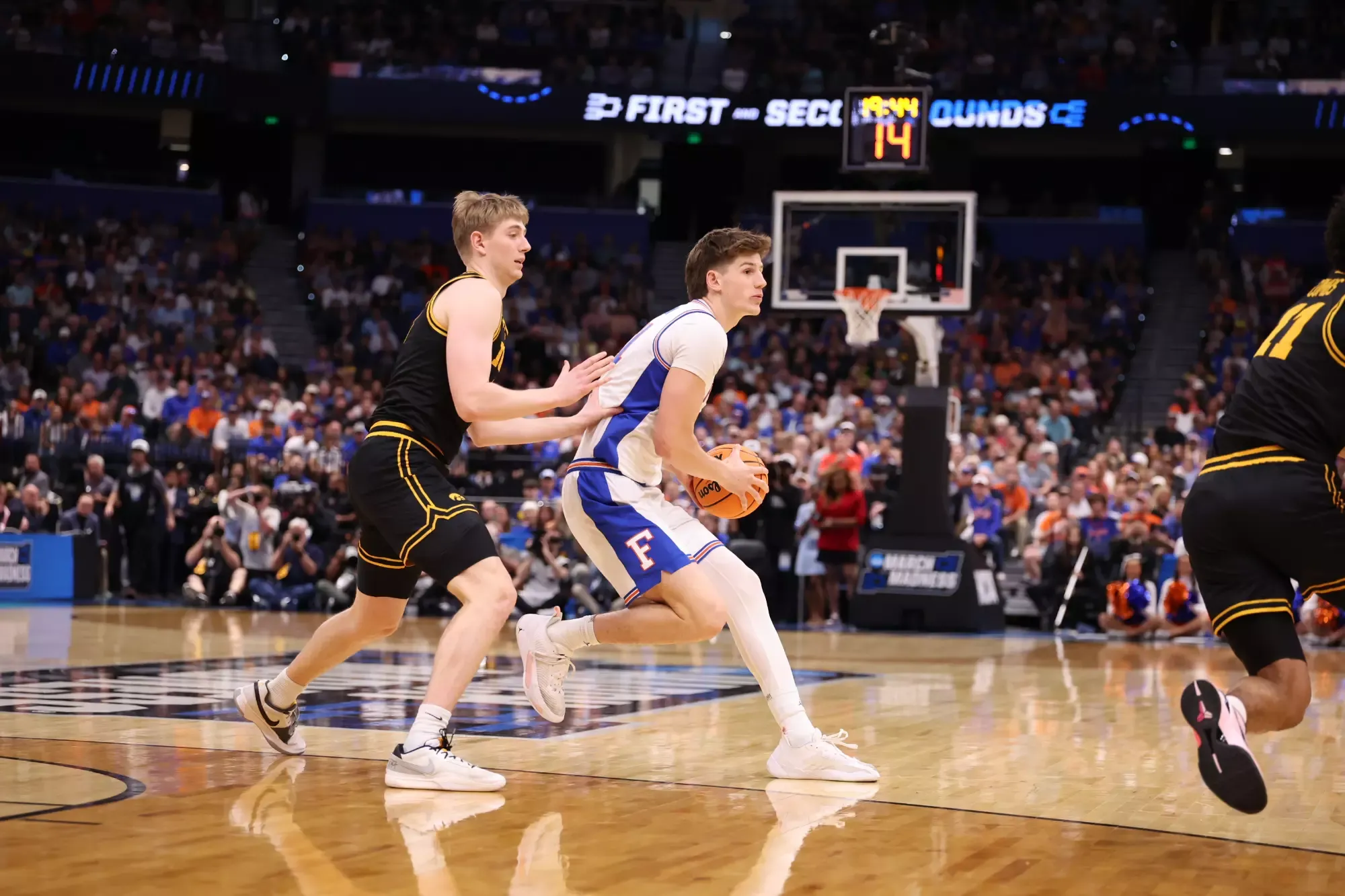 TAMPA, Fla. – Iowa forward Alvaro Folgueiras nailed a 3-pointer with 4.5 seconds to play and the ninth-seeded Hawkeyes shocked top-seeded and reigning national champion Florida 73-72 in second-round play Sunday night of the NCAA Tournament Southeast Region at Benchmark International Arena, ending the Gators' run as reigning national champions.UF had a last-ditch chance to win the game, but guard Xaivian Lee, on a hard baseline-to-baseline sprint, tried to the dump a pass off to forward Alex Condon, but the ball was knocked away as the final buzzer sounded.